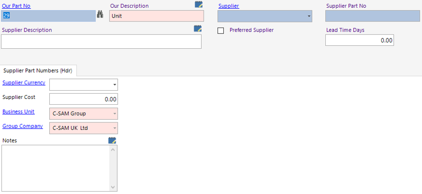 Note: The supplier part numbers tab is used to define a supplier ref number against your ref number. This tab is only used for 3rd party stock items which need to be purchased from a supplier.